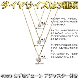 小さい爪とあずきチェーンおかげで、ダイヤモンドがより目立つ印象をあたえます。また、約2.5mmの横幅サイズはダイヤモンドの存在感を程よくアピールして胸元で輝きます。