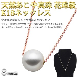 アコヤ真珠 ネックレス パールネックレス K18 ピンクゴールド 花珠クラス 約8mm 約8ミリ珠 40cm 長さ調節可能(アジャスター付き) あこや真珠 パール 本真珠